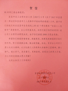熱(re)烈祝賀PE車間全體(ti)組(zu)員(yuan)榮(rong)獲“宜昌工(gong)(gong)人先鋒號”榮(rong)譽稱號。全公司同喜共慶,向你(ni)們(men)表(biao)示熱(re)烈祝賀!經公司工(gong)(gong)會委員(yuan)會研究決定,給(gei)予你(ni)們(men)班組(zu)2000元現金獎勵。 希(xi)望你(ni)們(men)班組(zu)珍惜榮(rong)譽,...