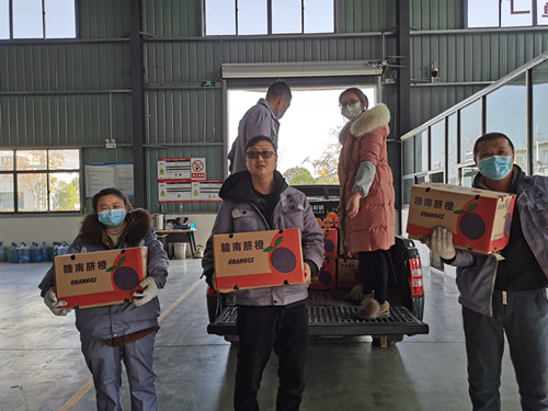 2022年12月(yue)12日,公司收到(dao)社(she)會(hui)友(you)好人(ren)士贈送(song)的一(yi)(yi)批精(jing)品甜(tian)橙,首先(xian)想(xiang)到(dao)的是一(yi)(yi)線(xian)員(yuan)工(gong)(gong)(gong),想(xiang)要與一(yi)(yi)線(xian)員(yuan)工(gong)(gong)(gong)分享這份“甜(tian)蜜”。在公司領導(dao)的授意下,行政部全體員(yuan)工(gong)(gong)(gong)一(yi)(yi)起行動,將這批橙子分發給生產一(yi)(yi)線(xian)的員(yuan)工(gong)(gong)(gong)。